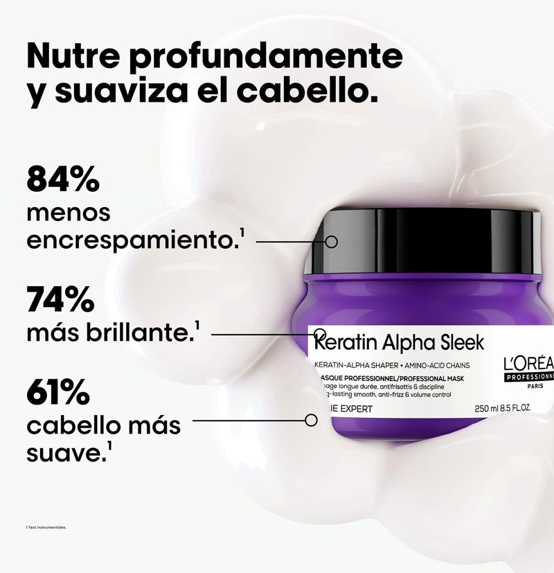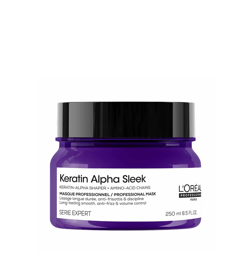 Mascarilla capilar profesional Keratin Alpha Sleek de L’Oréal Professionnel, formulada con Moldeador Keratin Alpha y aminoácidos.
