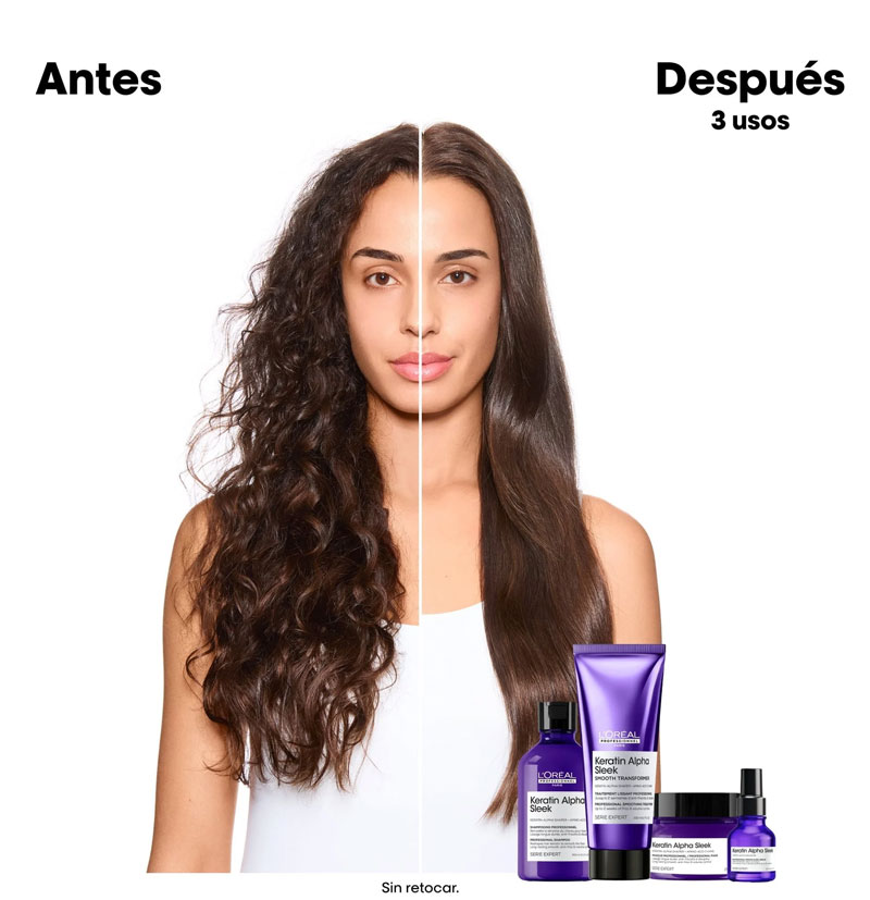 - Para un cabello más suave al instante, usa esta mascarilla. Para una suavidad duradera, usa Smooth Transformer una vez por semana y úsala los demás días de lavado. Después de usar el champú profesional Keratin Alpha Sleek, aplica uniformemente de largos a puntas.