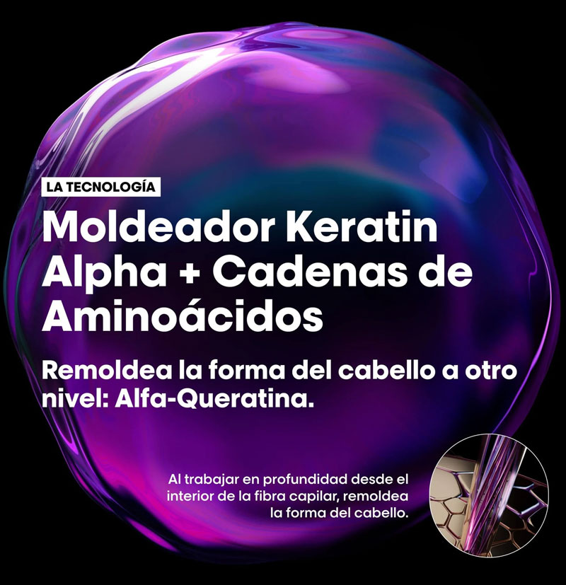 Formulado con Moldeador Keratin-Alpha y cadenas de Aminoácidos. Estos ingredientes ayudan a remoldear la forma del cabello a otro nivel: Alfa-Queratina, y suavizan la fibra capilar al tiempo que preservan su integridad.