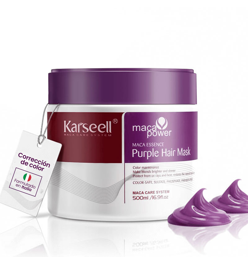 La mascarilla Violeta de Karseell está especialmente diseñada para cabello oscuro aclarado. Como una mascarilla intensa contra el tono amarillento, está enriquecida con pigmentos morados especialmente fuertes que hacen que el cabello muy aclarado o con reflejos luzca más brillante, claro y nutrido. Su fórmula única enriquecida con pigmentos e ingredientes nutritivos le otorga a la Mascarilla Violeta no solo poderes neutralizadores del tono amarillento, sino también un efecto nutritivo intensivo. El cabello dañado por la aclaración se vuelve instantáneamente flexible y más fácil de peinar. El resultado: un cabello rubio radiante y con aspecto nutrido.