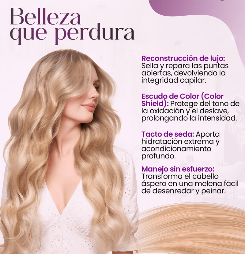 - Enjuaga bien y disfruta de un cabello fortalecido, revitalizado y sin tonos amarillos.
