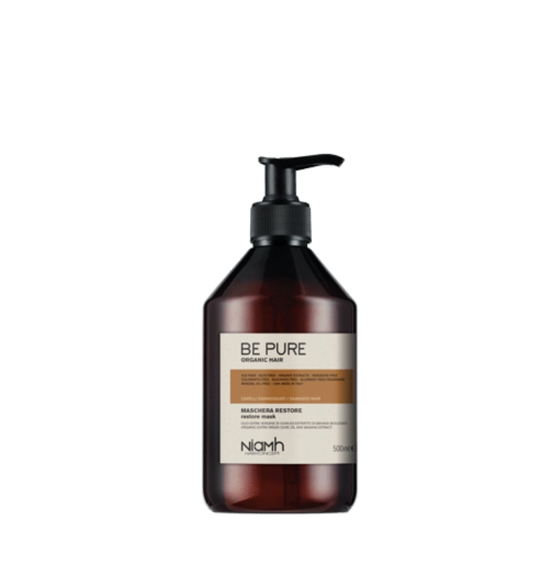 Mascarilla Restauradora Be Pure para cabello dañado por agresiones externas, ya sean naturales o sintéticas. El mal uso de aparatos de peinado (secadores y rizadores), el uso de tratamientos químicos invasivos (coloración, tinte o decoloración) y los daños ambientales someten tu cabello a un estrés acumulativo constante , causando daños considerables. Gracias a la sinergia del aceite de oliva virgen extra y el extracto de plátano orgánico, la fórmula de esta mascarilla restauradora combate el daño a la vez que promueve una regeneración profunda desde la raíz hasta las puntas. El resultado: un cabello más fuerte, sano y manejable .