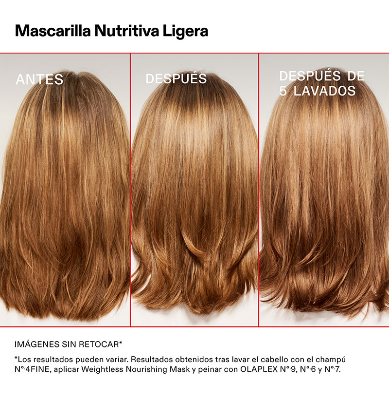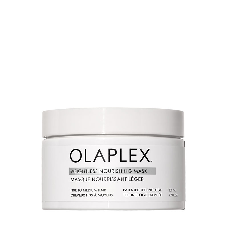 OLAPLEX WEIGHTLESS NOURISHING MASK. Esta mascarilla capilar voluminizadora instantánea para cabellos finos a medios está formulada con tecnología biomimética de la cutícula para fijar una hidratación ligera y sellar las cutículas capilares durante 5 lavados. Potencia el brillo de inmediato, reduce la rotura y ayuda a evitar que el cabello se rompa lavado tras lavado para favorecer la retención de la longitud capilar a lo largo del tiempo.