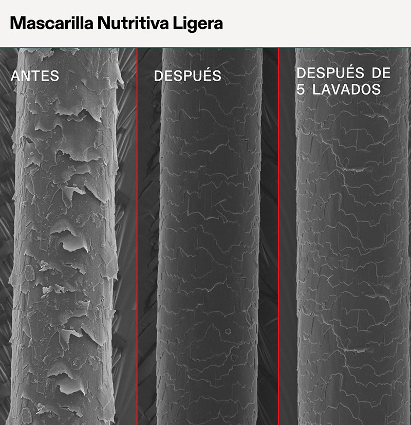 *En mechones de cabello virgen - Reduce y previene la rotura incluso después de 5 lavados