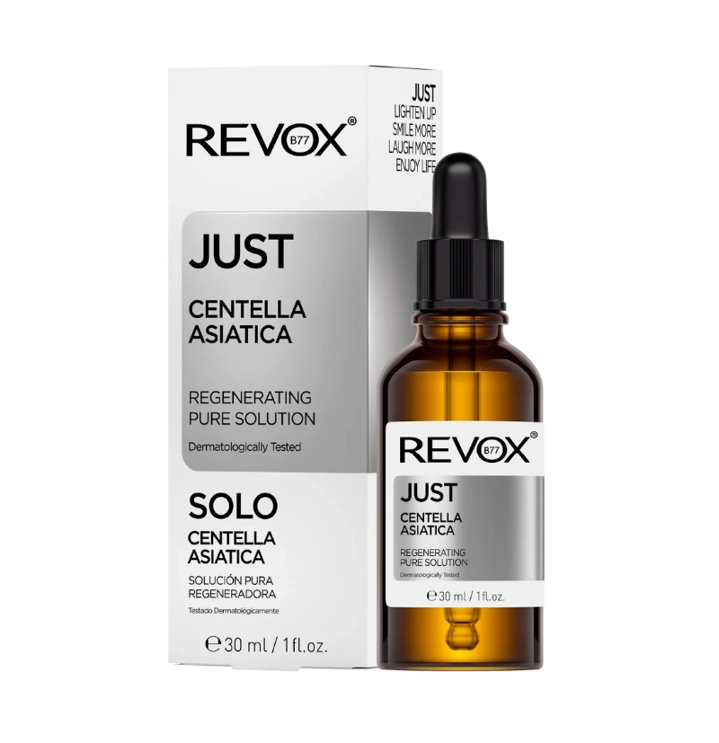REVOX B77 JUST CENTELLA ASIATICA 100% es una solución facial calmante que ayuda a regenerar la piel y devolverle su equilibrio e hidratación natural. Los factores externos agresivos pueden irritar la piel y, por lo tanto, dañarla. El extracto de Centella Asiática es una potente fuente de sustancias bioactivas y aminoácidos que ayudan a reponer, calmar e hidratar la piel. Centella Asiática tiene efectos calmantes que ayudan a que la piel sensible se recupere y luzca más saludable y suave. También conocido como CICA o Tiger Grass, se usó en la historia por sus propiedades curativas y de tratamiento, lo que le valió al ingrediente un gran reconocimiento más allá de Asia, de donde es originario. Este extracto tiene una potente acción antioxidante, protegiendo la piel de los radicales libres y fortaleciendo la función de barrera epidérmica. La solución ayuda a la piel a retener la hidratación y mejora su apariencia general.