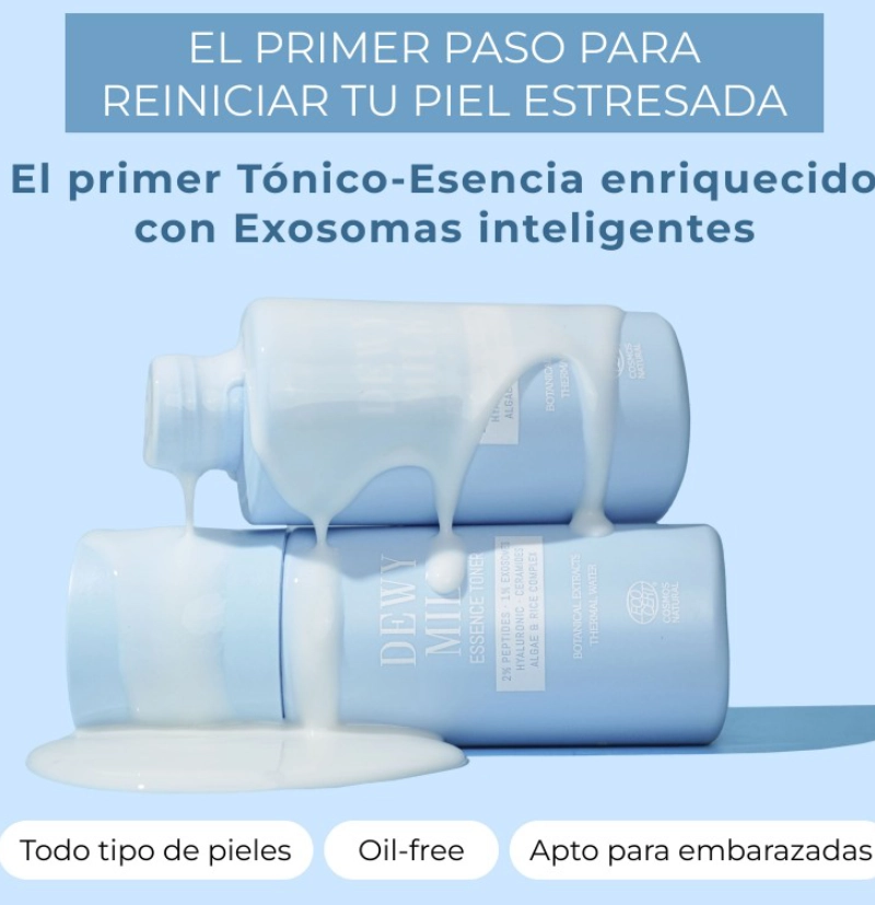 Dewy Milk Essence Toner es un tónico lechoso de textura ligera y oil-free que actúa como primer paso en la rutina facial para pieles +40 años o como hidratante único para pieles jóvenes.